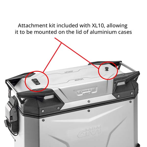 The XL10 from Givi’s X-Line range is designed to work seamlessly with aluminium top-loading panniers. Using an innovative magnetic mounting system, it attaches securely to the case lid and releases with a quick pull of the zip slider. An attachment kit and drilling template are supplied for easy installation.