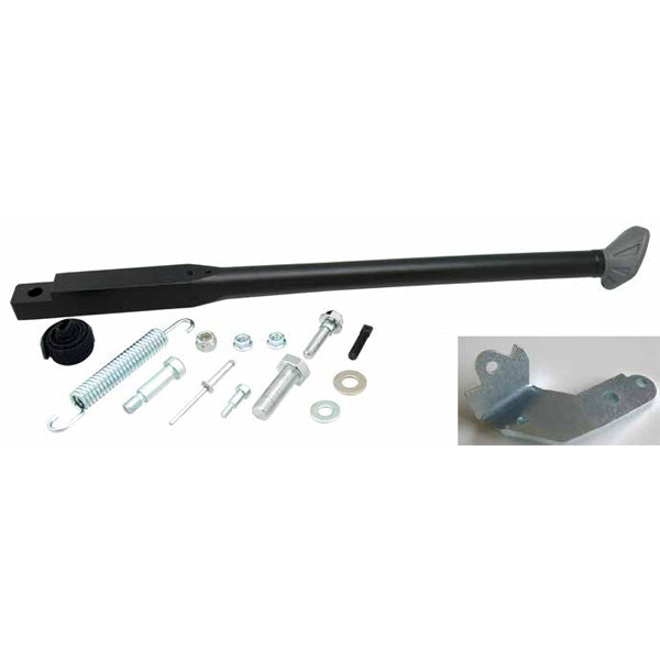 6061-T6 Aluminium side stand complete with all necessary fasteners, spring, fixing plate, and rubber tie.