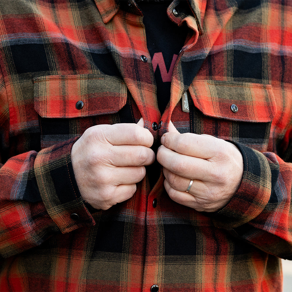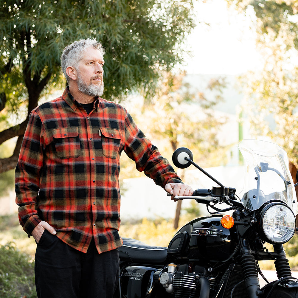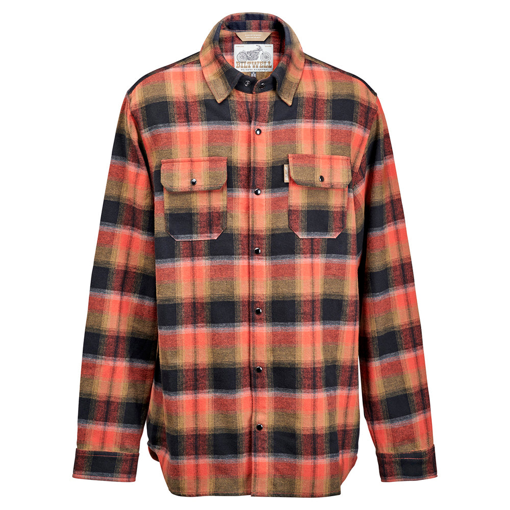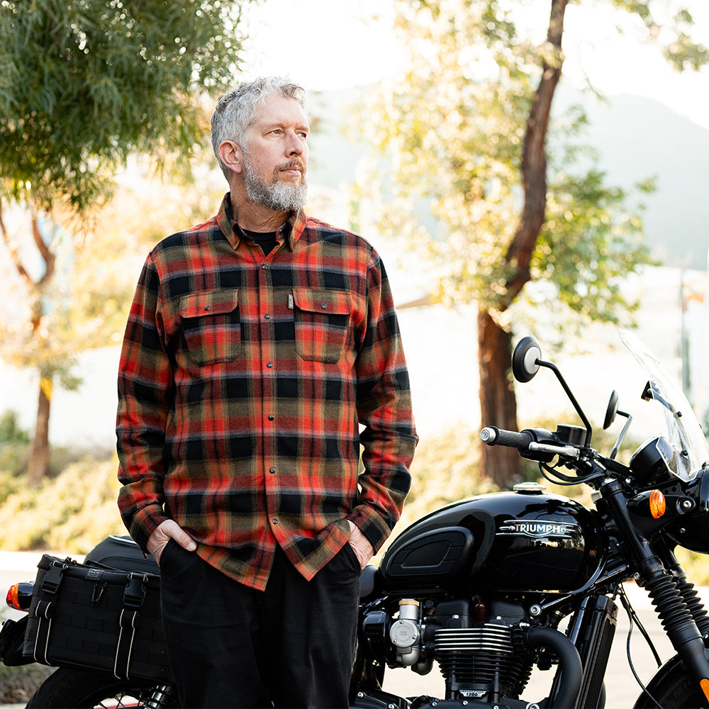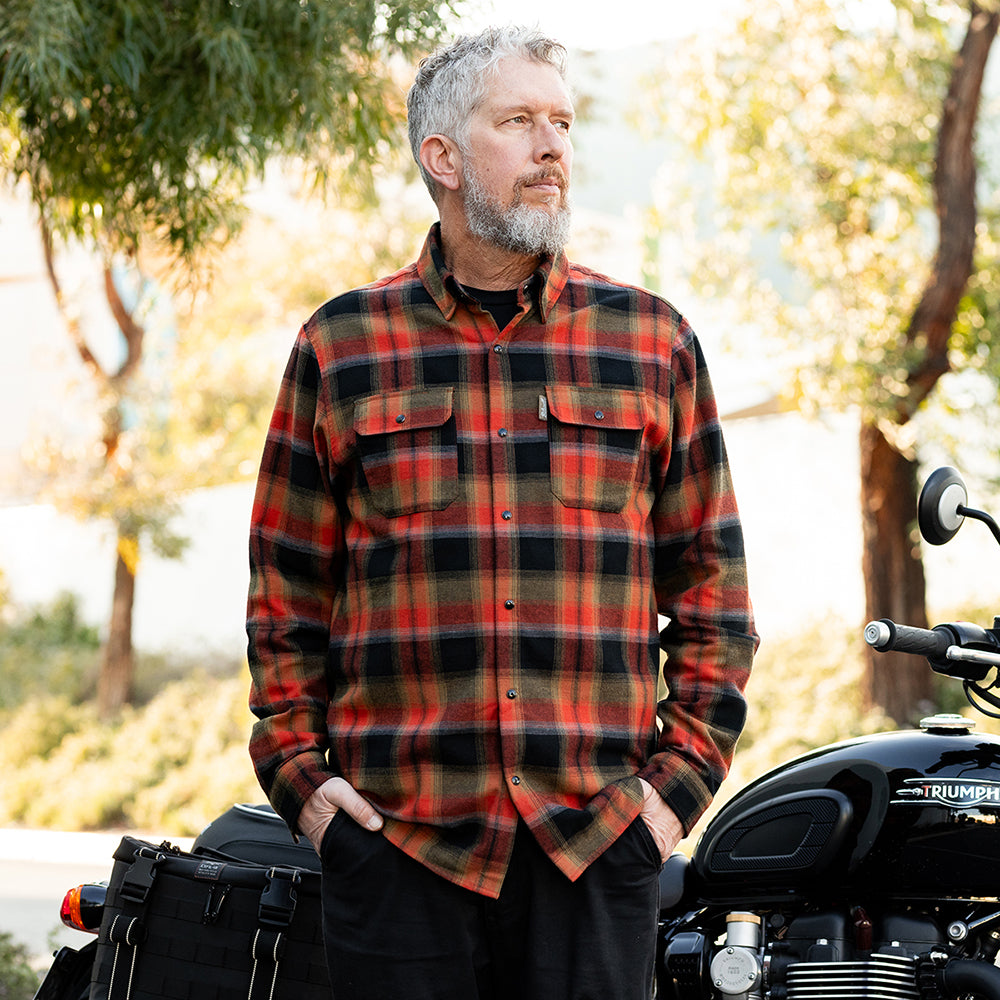 Our Hi-Test Flannel lets you move from job site to date night without breaking a sweat. Crafted with 100% heavyweight cotton for durability and comfort. Roomy tailoring enhances mobility. Single- and double-needle polyester stitching throughout. Moto-specific features include elastic thumb loops inside the cuffs, and hidden snaps in the collar tips to kill collar flap at high speeds.