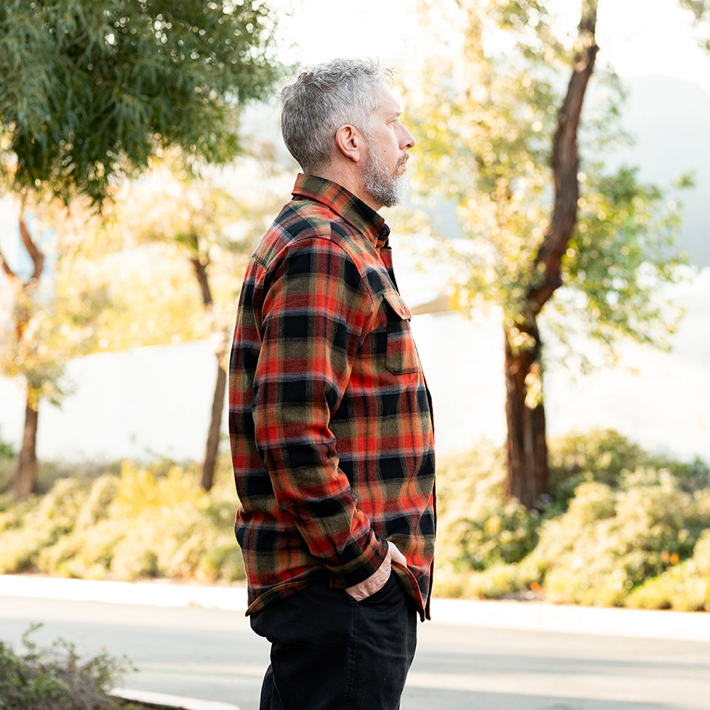 Westy (6’, 200lb.) is wearing our Rust Plaid Hi-Test flannel in size Large.