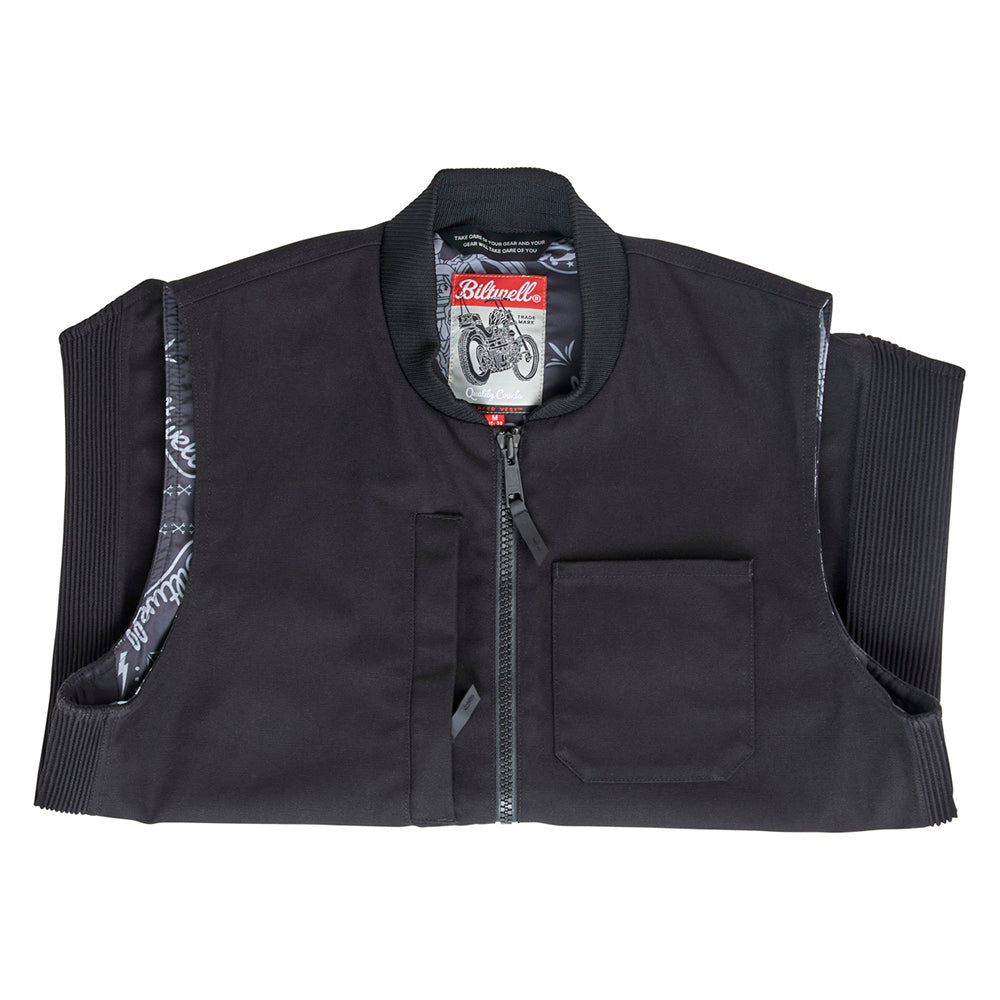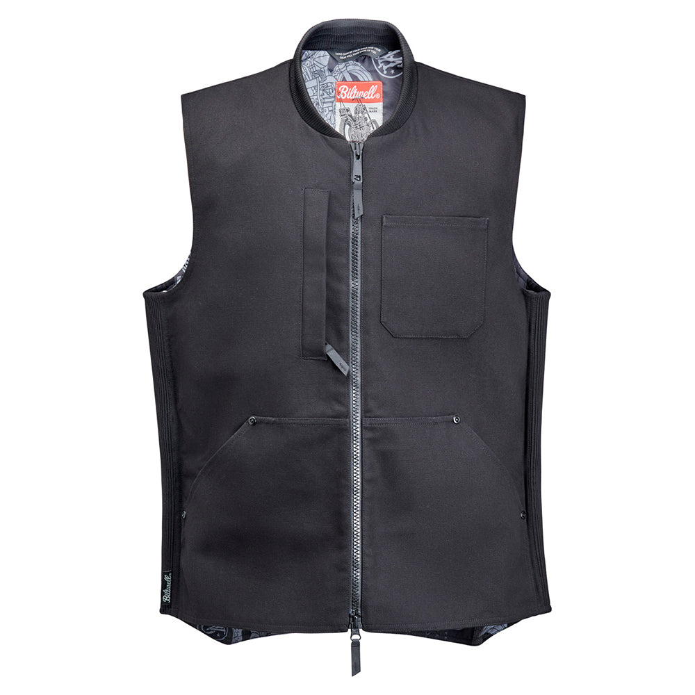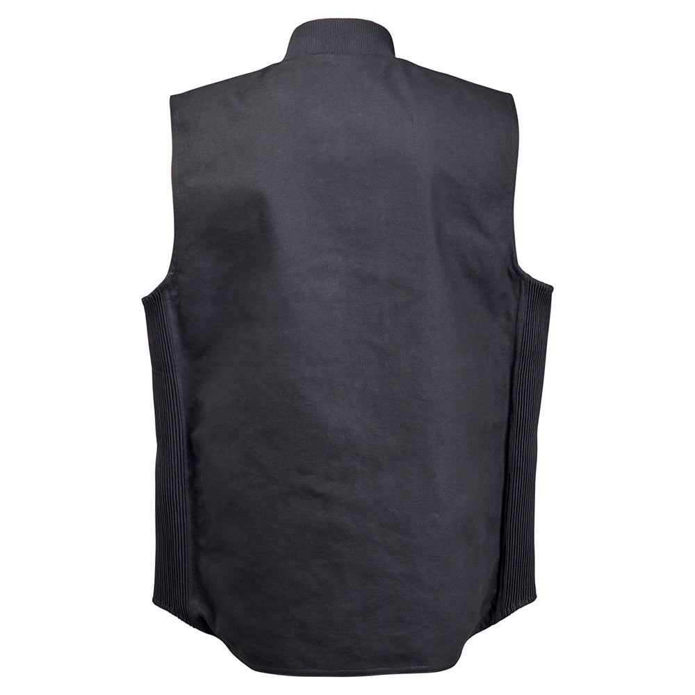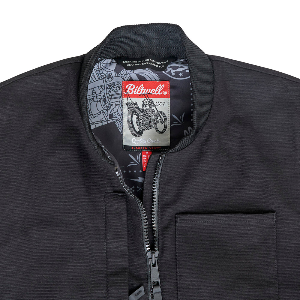 Every bike rider needs a rugged vest in their gear arsenal, and our 4-Speed Vest answers the call. Its heavy-duty cotton canvas exterior features generous sizing and elasticated expansion panels so you can layer it over a shirt, hoodie, or reinforced riding jacket. Two-way zipper with Hypalon pulls lets you fine-tune fit at the collar and waist. A breathable polyblend liner is built in to keep you warm and comfortable. Two interior and four exterior pockets are perfect for hauling gloves, glasses, and other EDC essentials.