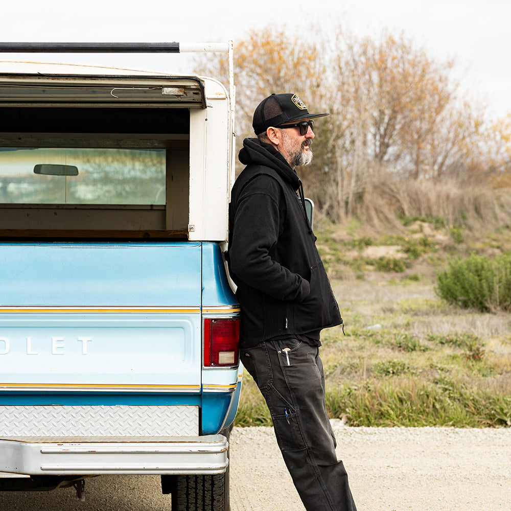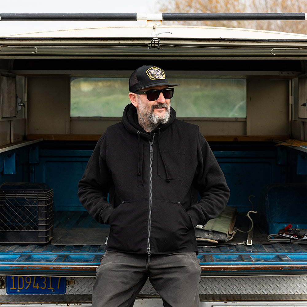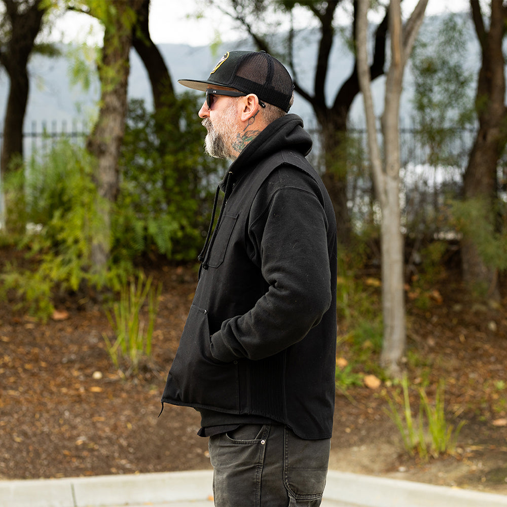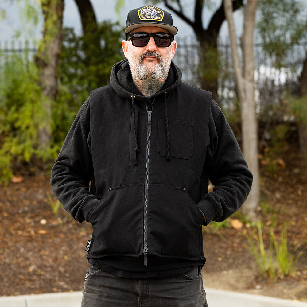 Otto (6’2”, 185lb.) is wearing our Black 4-Speed vest in size Large over a Biltwell hoodie.