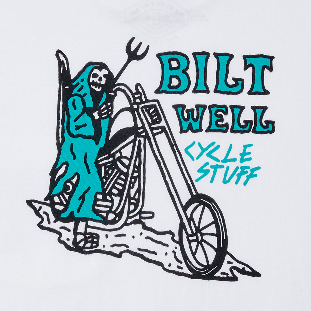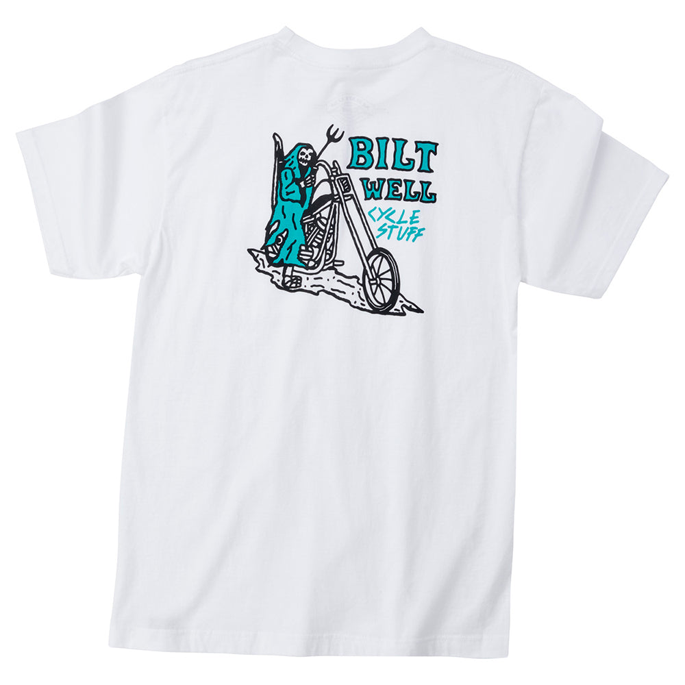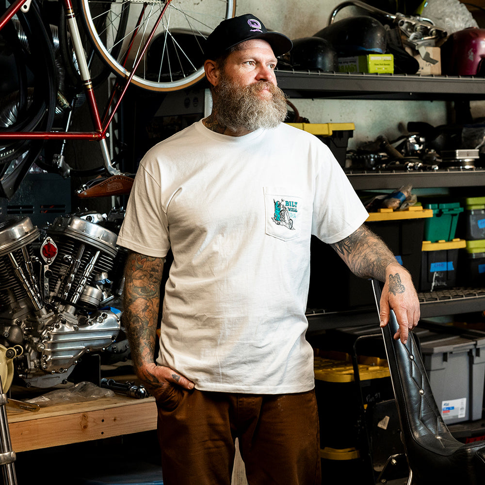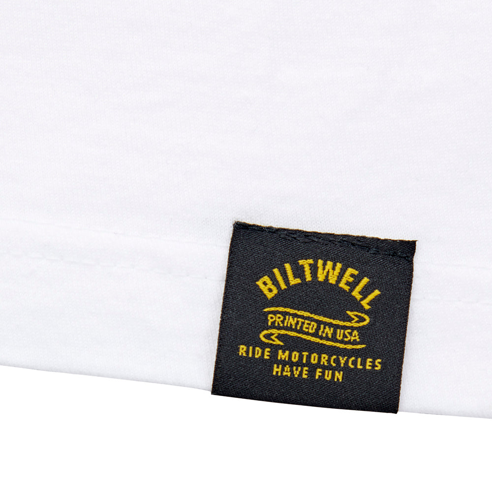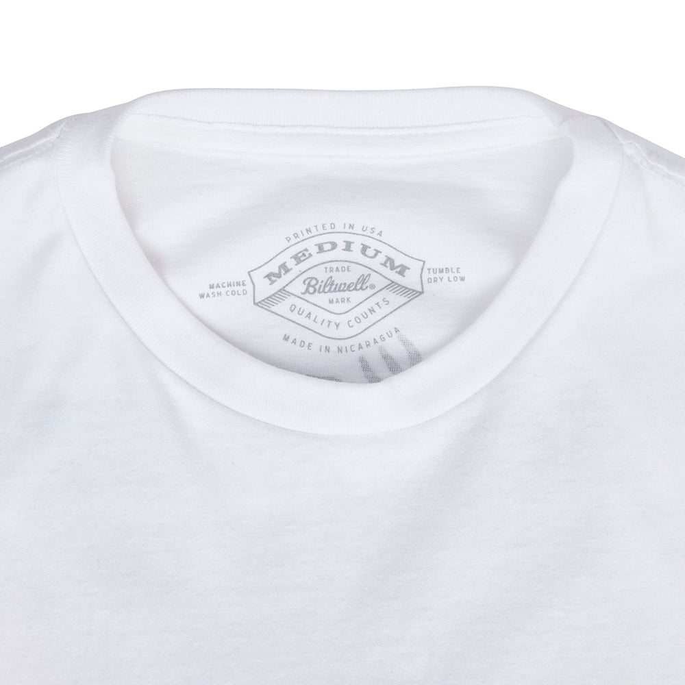 100% pre-shrunk 6oz cotton tee is detailed with hand-screened water-based inks, woven clip tags and the irritating collar tag has been replaced by a screen-printed label.