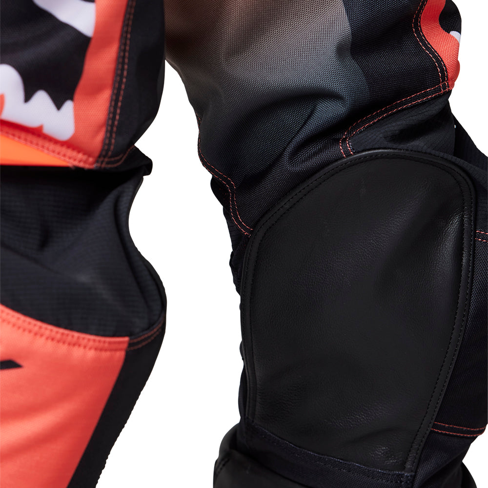 - Heat and abrasion-resistant leather knee panels increase durability against knee braces, guards, and the bike