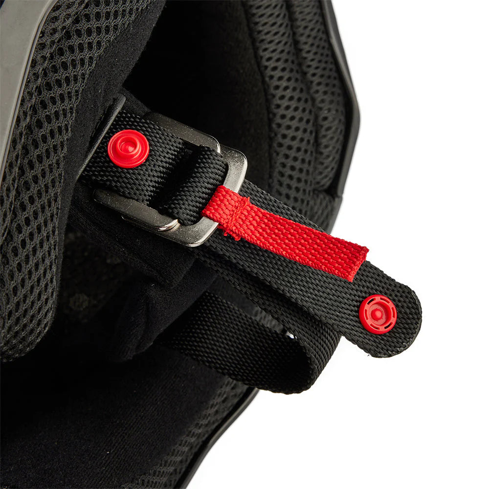 - Steel D-ring chin strap closure