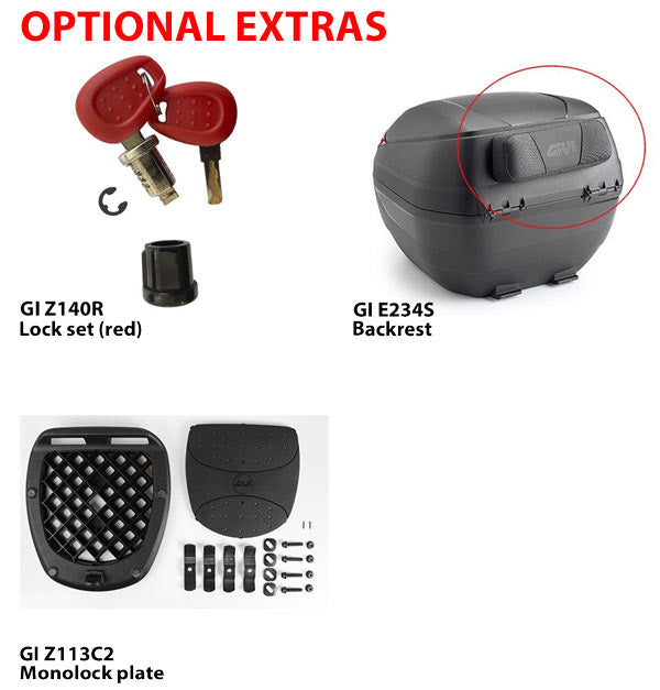 Lightweight but sturdy, this sleek looking 30 litre top box is ideal for commuting. For the first time on a Monolock case, Givi has deployed a technique called 'undercut moulding' which allows all of the structure to be contained within the case so the outside lines are smooth and rounded for a more aerodynamic shape and more appealing look. It's compact size doesn't compromise load capacity - the C30 will fit a helmet with space for a few other small items. Using Givi's Monolock attachment system, the C30 comes with a universal mounting plate for fixing to your scooter's rack. Maximum loading of 3kg.