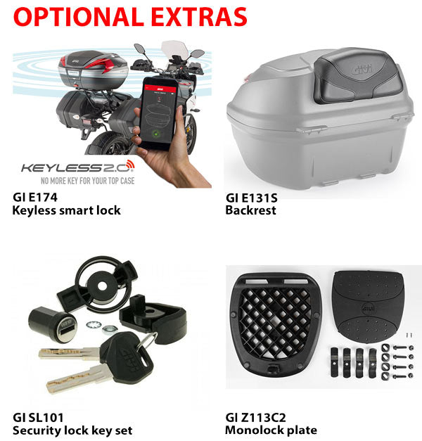 This 36 litre Monolock top box comes in black with carbon look panels. A great size to easily fit one full face or two scooter helmets plus more. Comes with mounting plate included. Maximum loading of 3kg.