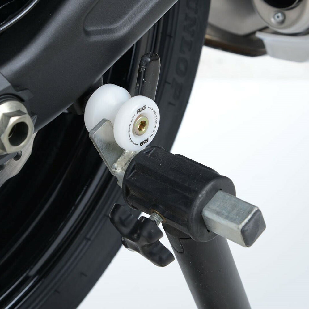 A product with two uses, allowing the use of prong type paddock stands and helping to protect the swingarm of the bike.