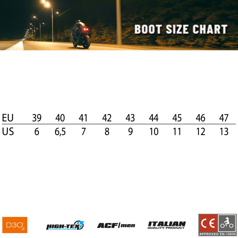 The styling of the Falco Patrol 2 motorcycle boots enable them to easily span into the urban motorcycle shoe market with waterproofing features. The High-Tex Advanced Membrane is resistant to water penetration and is certified waterproof. The D3O® Impact Protection, developed in snow sports and the military industry, was first applied to motorcycle boots by Falco. "D3O Intelligent Molcules" flow freely when moving slowly but on shock, lock together to absorb impact energy. Transmitted force to ankle-foot area is significantly reduced thanks to D3O® exclusive support. With a stylish urban look, and a high-grip heavy-duty rubber sole, the Falco Patrol 2 motorcycle shoe is ready to ride along with you.