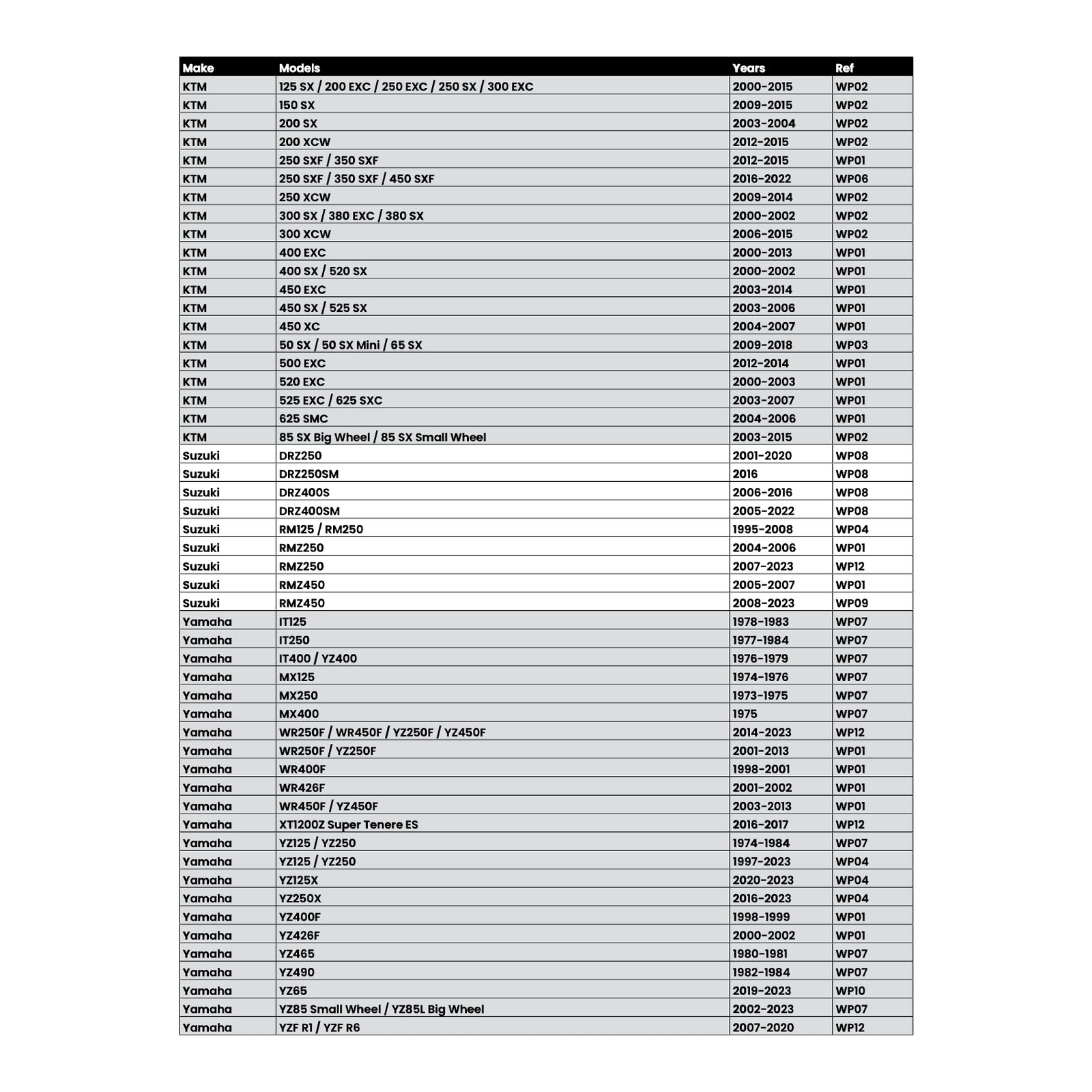 Note:Some KTM/Husqvarna/Gasgas models may require using the OEM cam or the additional purchase of White’s cam set WPGRPLGC13.
